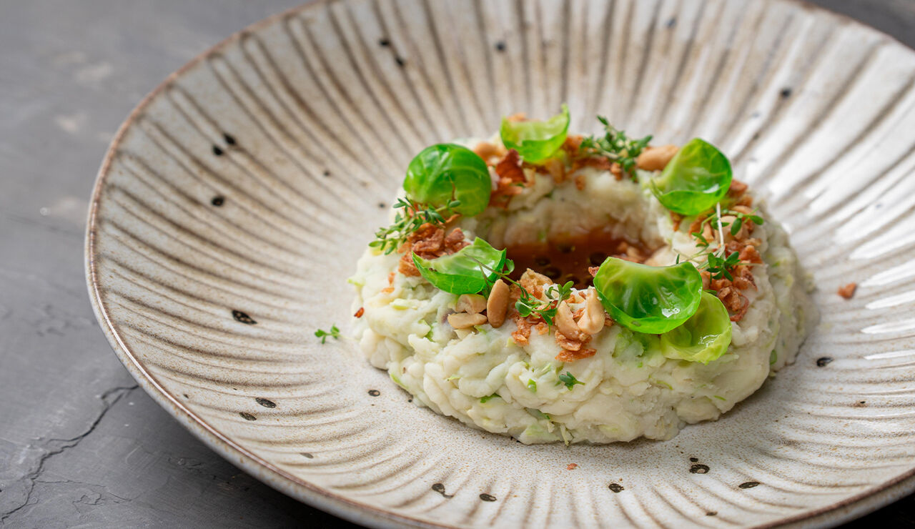 - Maak het geheel af door de geblancheerde spruitjesblaadjes kunstig over de stamppot te draperen.