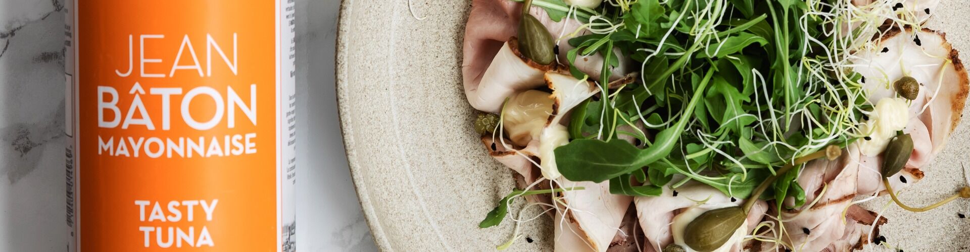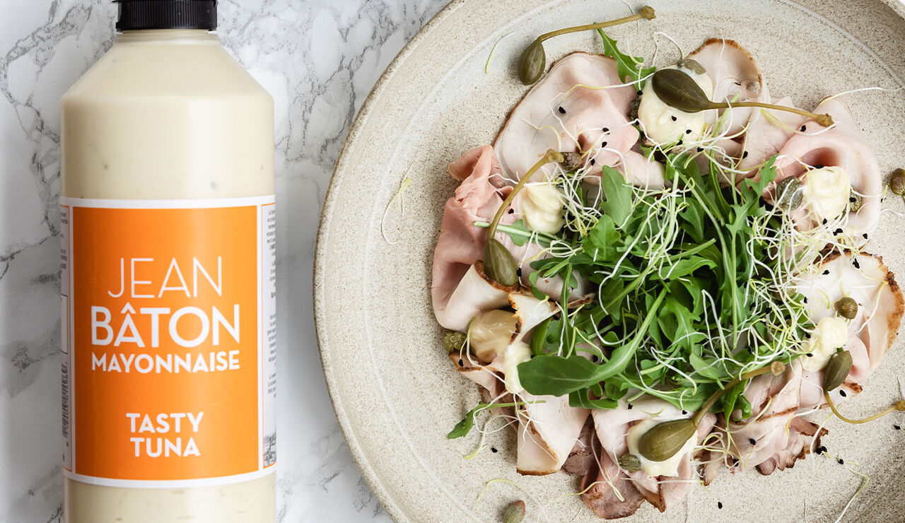 - Verdeel het kalfsvlees over twee borden. Leg rucola in het midden en verdeel hier overheen 1 el kappertjes en 4 kapperappeltjes. Maak af met de Tasty Tuna mayonaise en wat versgemalen zwarte peper.