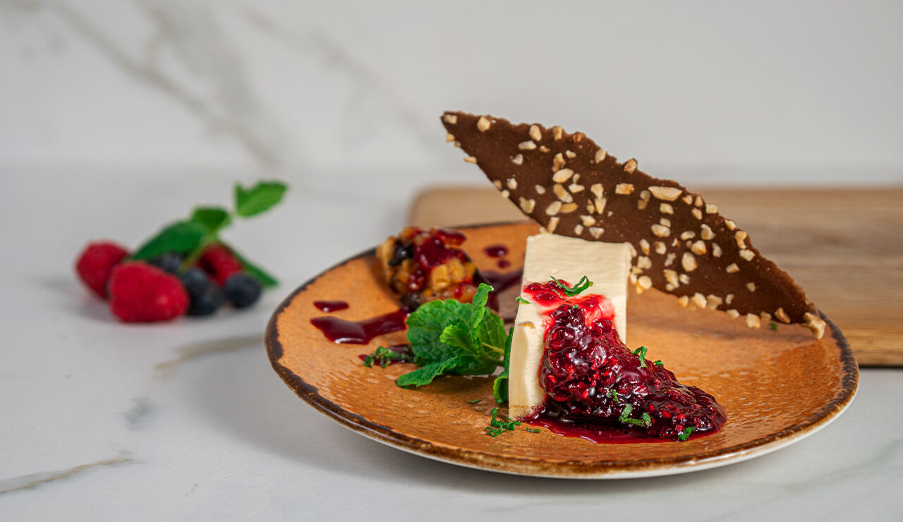 - Maak een quenelle van de kleine gesneden tutti frutti en leg die leuk op het bord neer.