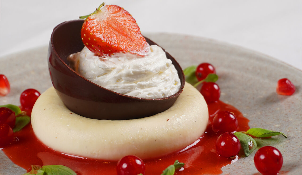Panna cotta met witte chocolade mousse en aardbeien coulis