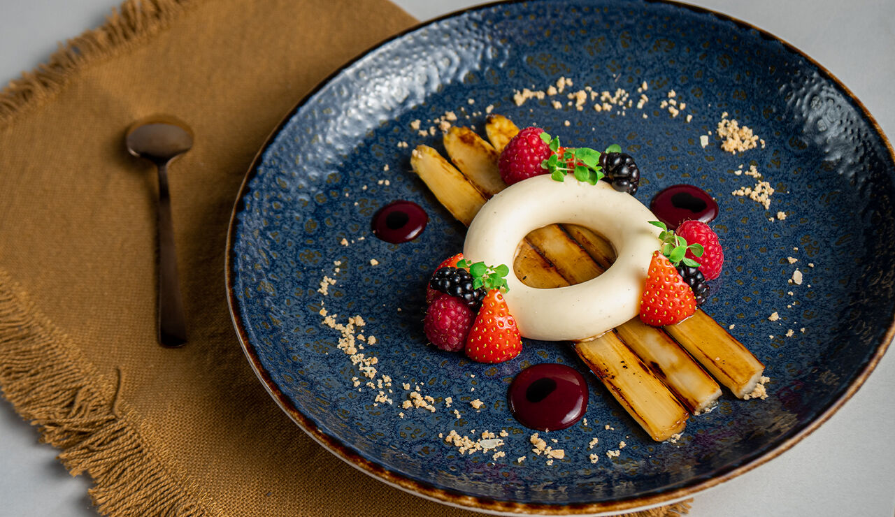 - Garneer het gerecht af met de coulis van rood fruit en de crumble en de honing cress
