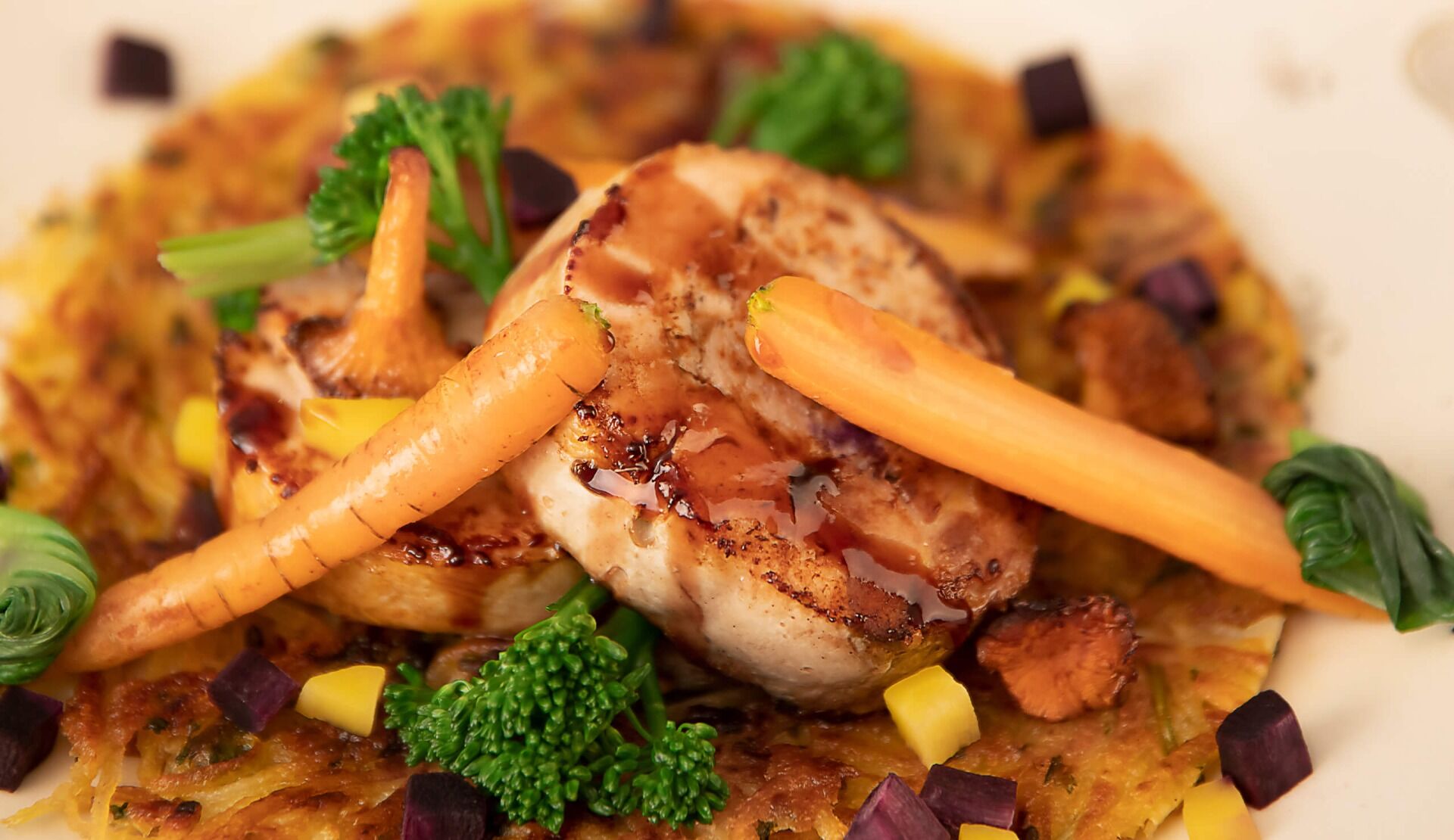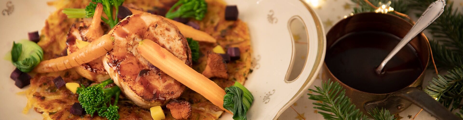 Parelhoenrouleau met rösti, geblancheerde groente en rode wijnsaus