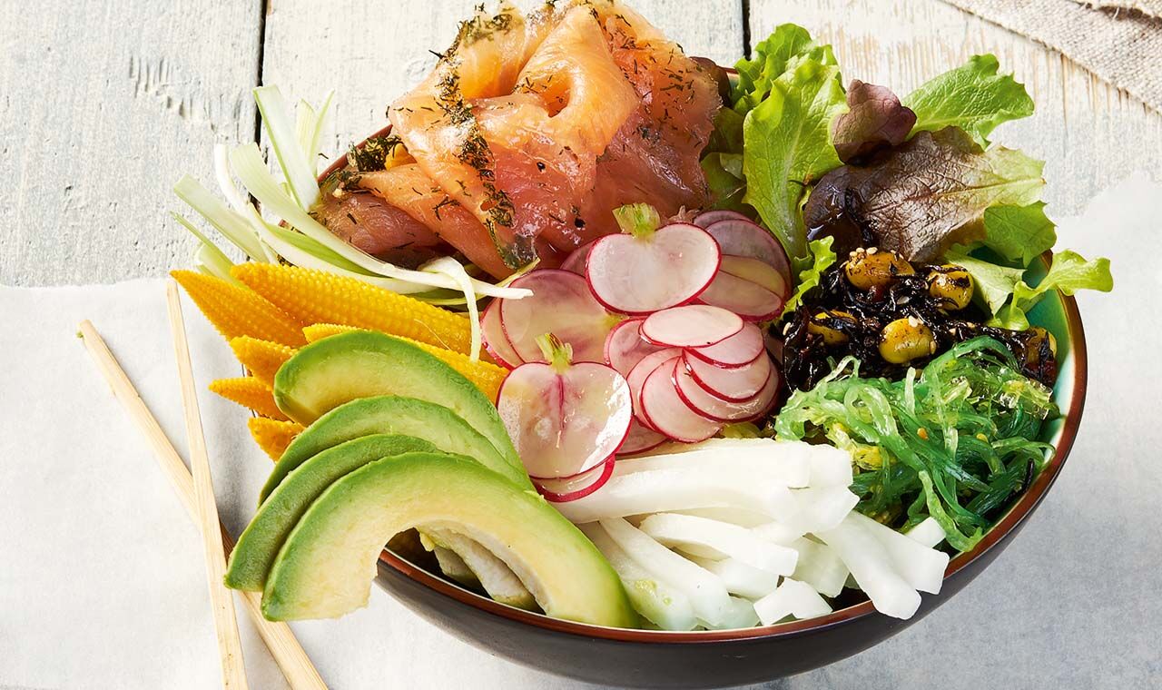 - Snijd de avocado in plakjes, snijd de mini mais door de helft en kook de mais beetgaar.