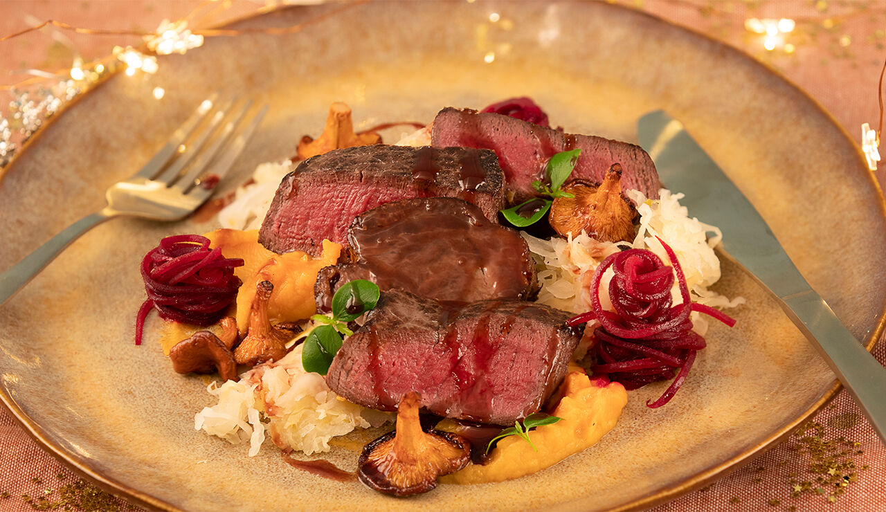 Zet een streep aardappelpuree op het bord en verdeel hier drie hoopjes zuurkool op. Trancheer de hertenbiefstuk, leg de plakken op de zuurkool en verdeel hier de sukade tussen. Draai torentjes van de spirelli (rode biet) en zet deze op het bord. Verdeel de cantharellen over het bord en steek hier en daar een plukje cress. Giet als laatste wat saus over het gerecht.