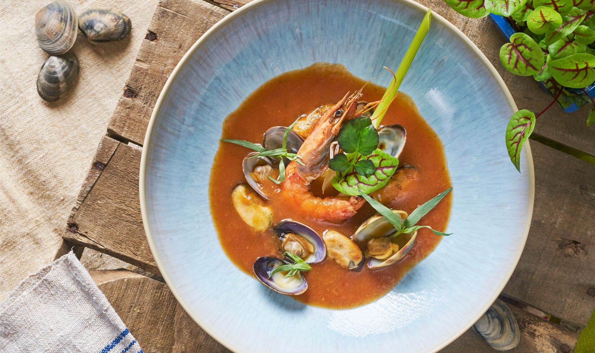 - Doe de garnalen, vongole, mosselen en venkel in een diep bord en schenk de vissoep er over heen.