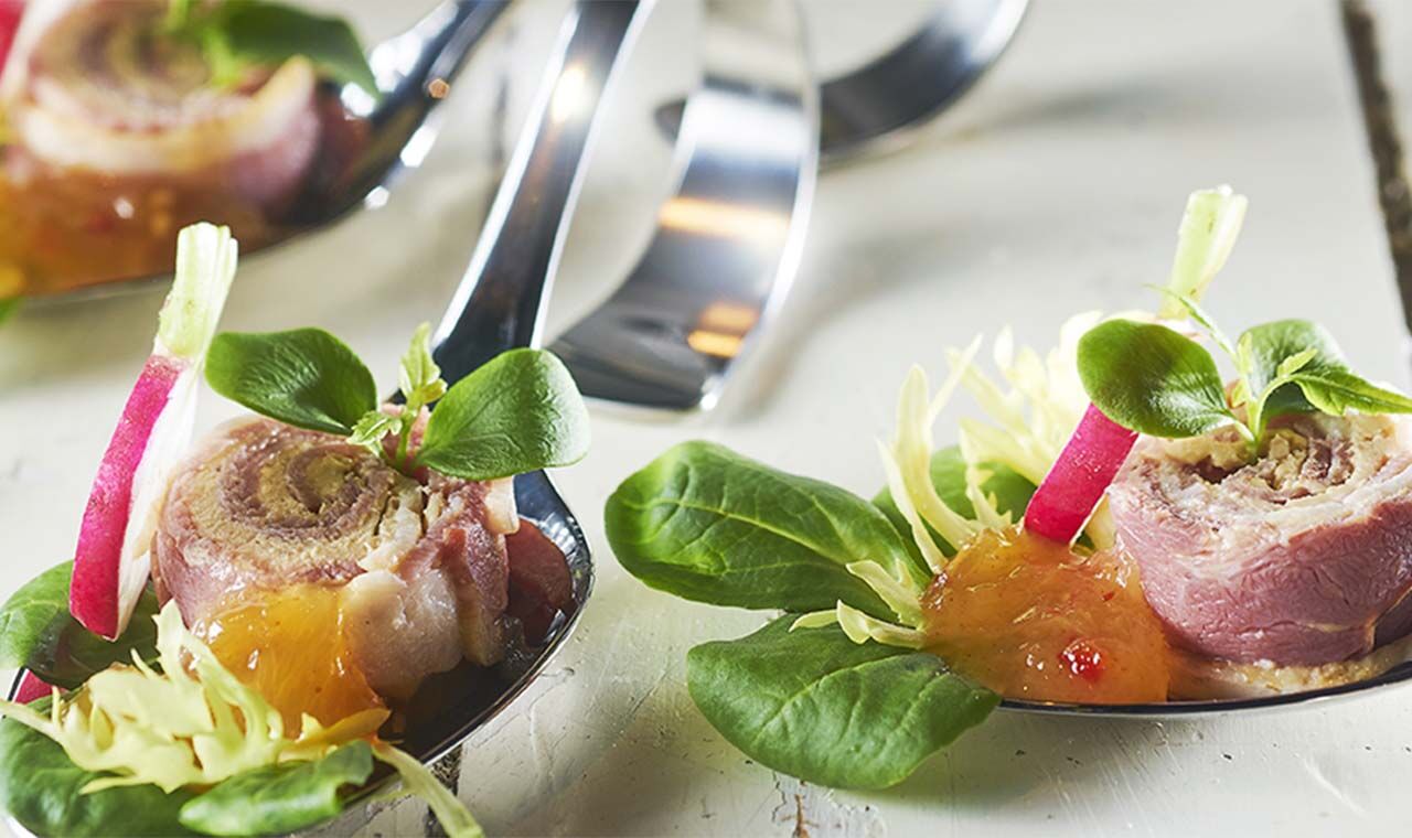 - Snij de rouleau in plakjes van zo’n 2 centimeter dik en leg elk plakje op een amuselepel.