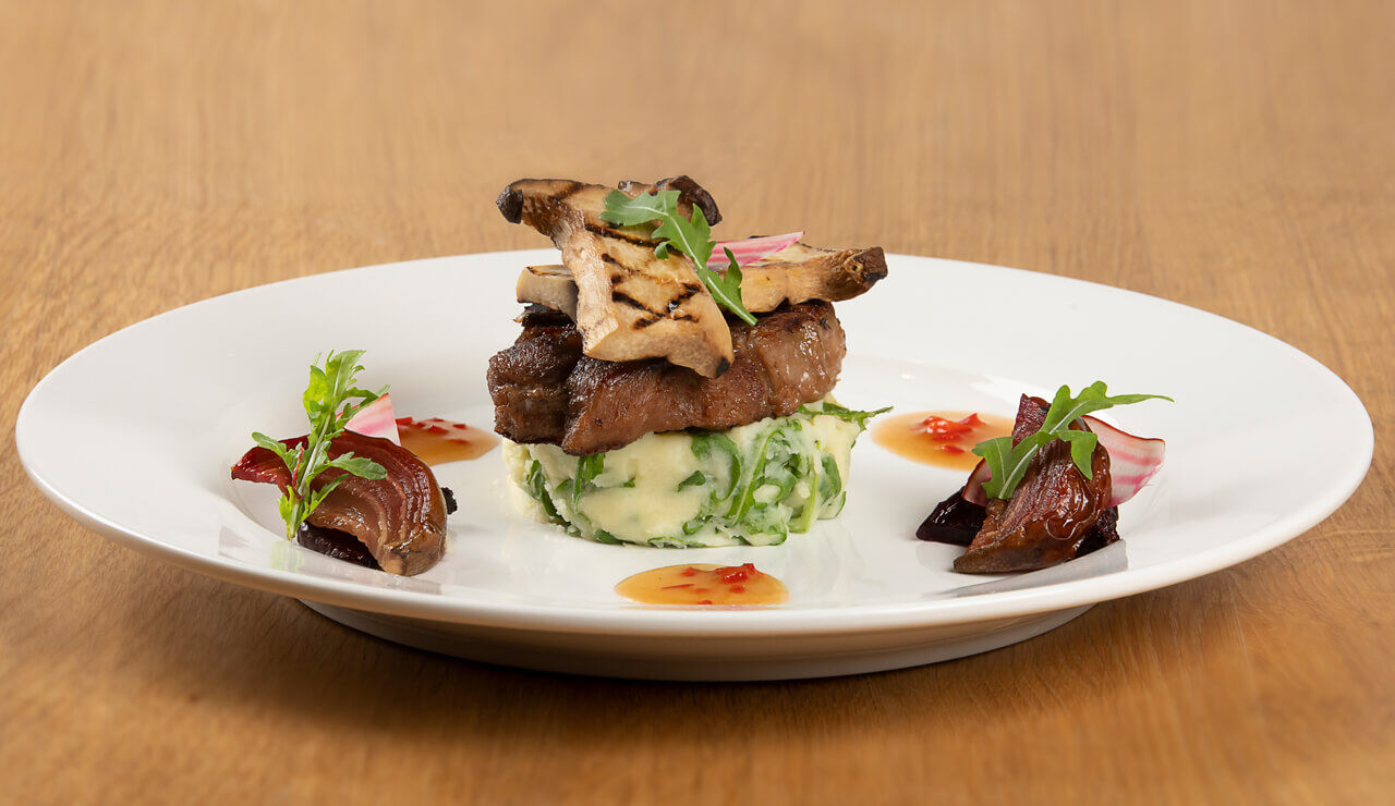- Leg op de stampot de kalfssukade en daarop de gegrilde plakjes king boleet.