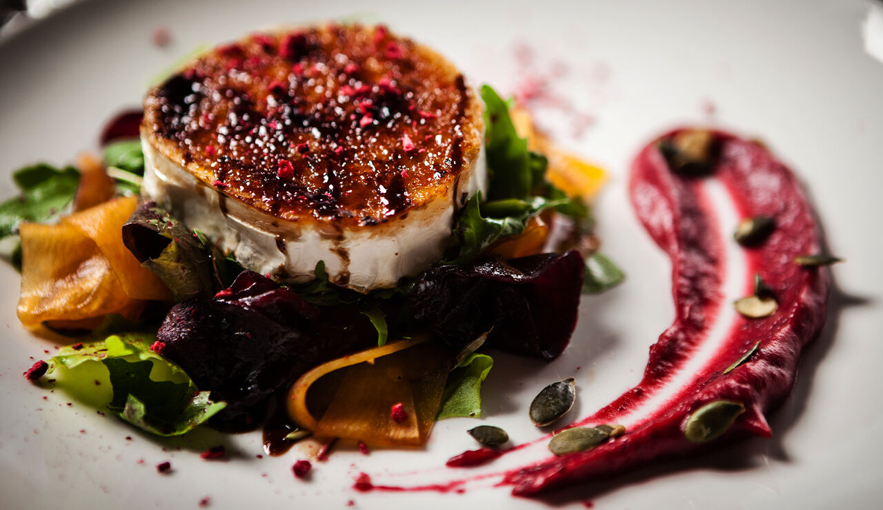 Salade met gegratineerde geitenkaas en crème van rode biet
