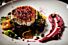 - Strooi een laagje suiker boven op een plak geitenkaas en karamelliseer deze met een gasbrander.