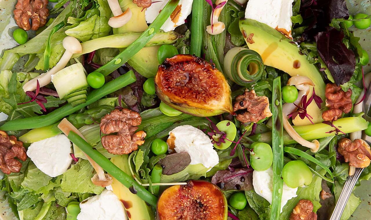 - Leg de gekarameliseerde vijgen op de salade en druppel de balsamico over het geheel.