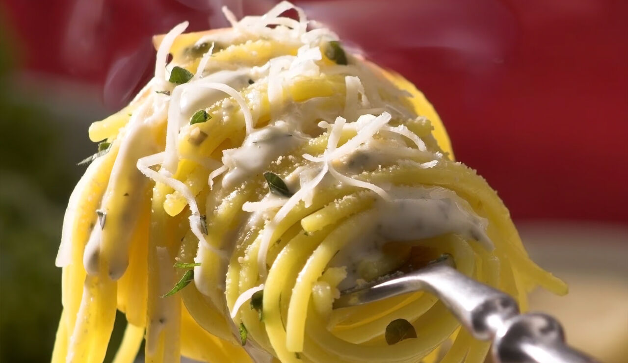 - Kook de spaghetti in een grote pan met voldoende water en een snufje zout. Giet af nadat het gekookt is.
