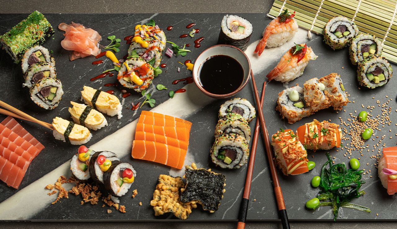 Streetfood sushi met uramaki, nigiri tamago en sashimi
