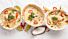 Schenk de soep in een kom en verdeel hier de taugé, oesterzwam, rode peper, bosui, maïs en garnalen over.