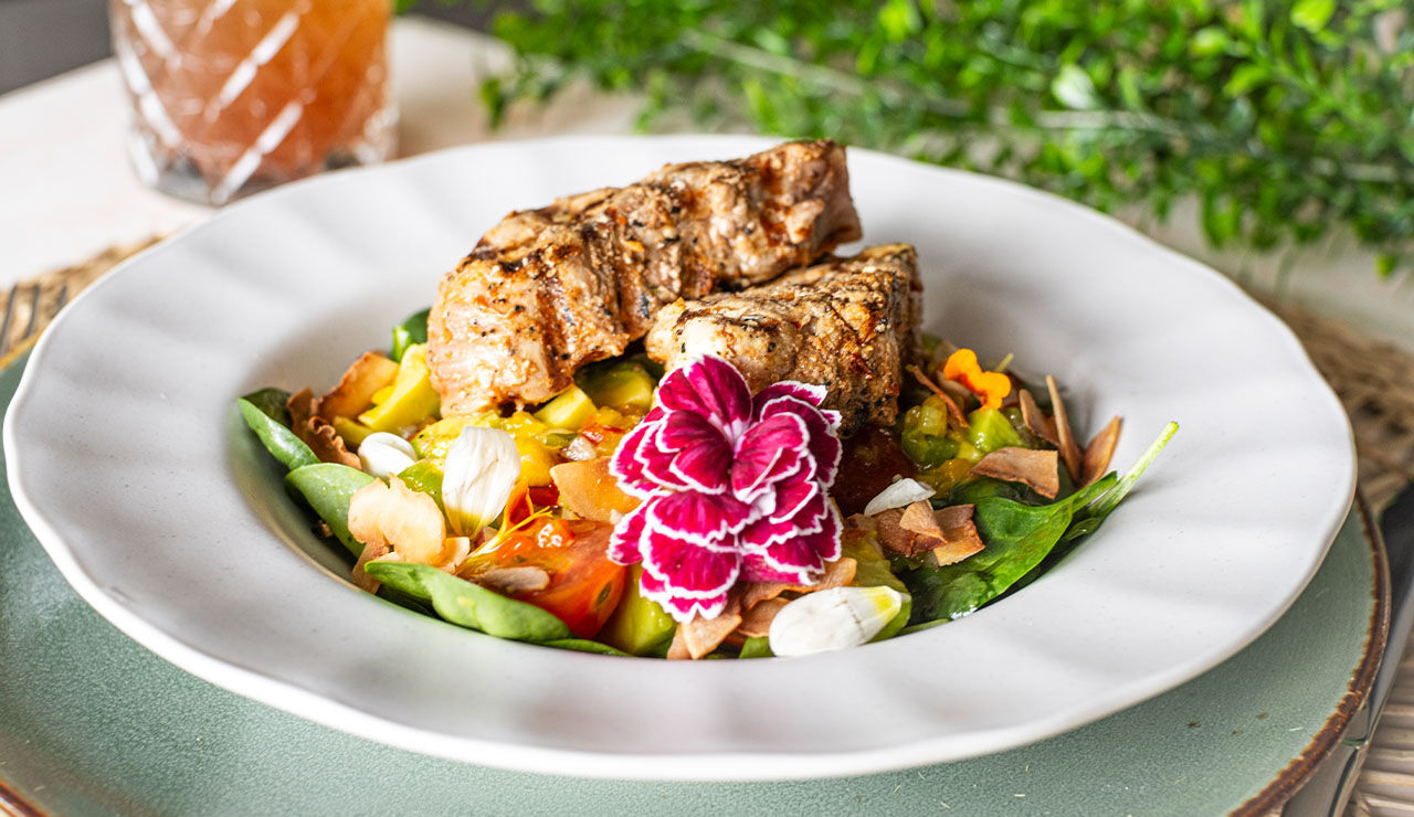 Tropische salade met gegrilde varkenshaas en een salsa van mango en baby spinazie