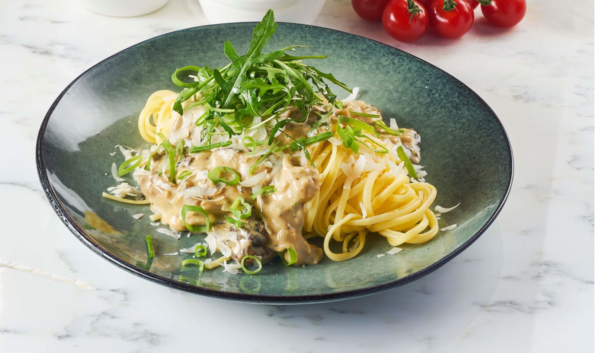 - Meng de linguine met de paddenstoelen roomsaus en voeg naar smaak de truffel tapanade en olie toe, en verdeel het over de borden.