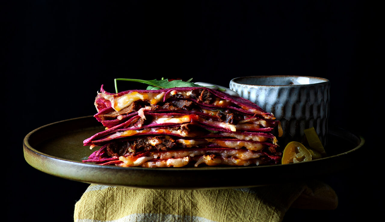 Vega quesadilla Texmex style met pulled jackfruit en frijoles