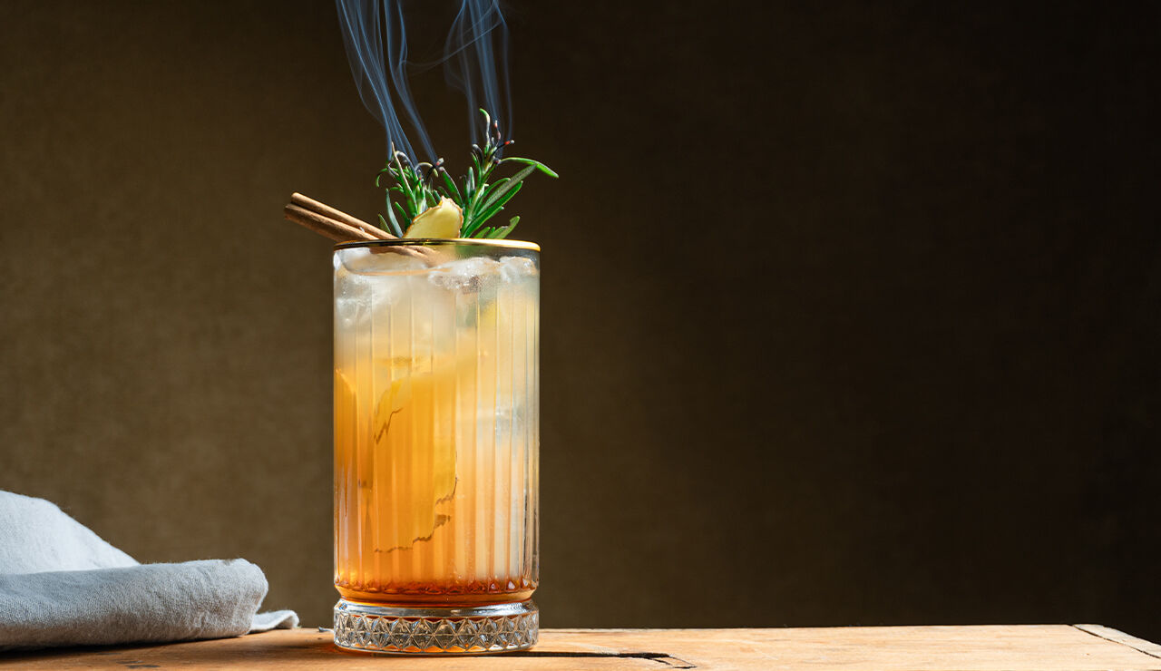 - Garneer de cocktail af met een kaneelstokje, gember en een takje rozemarijn.