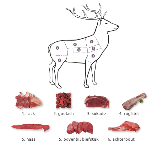 Hertenvlees is heerlijk te combineren met appel, peer, uien, knolselderij, pastinaak, rode biet, rode kool, zoete aardappel, cranberry’s, jeneverbes en rode wijn.