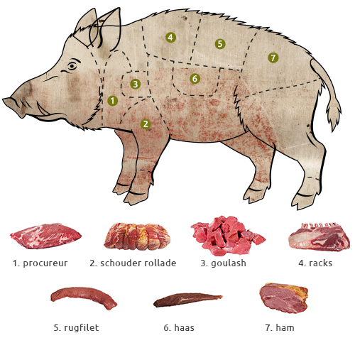 De voorouder van onze varkens en ook wel everzwijn genoemd, is een populair stuk wild. Afhankelijk van leefgebied en leefomstandigheden kan een volwassen mannetje wel 300 kilo wegen en een vrouwtje rond de 200 kilo. Het zijn - kieskeurige - alleseters die zich al struinend door de bossen voeden met eikels, kastanjes, wortels, knollen, maar ook vruchten, kikkers en slangen. Het wild zwijn in ons assortiment is afkomstig uit diverse landen in Europa.