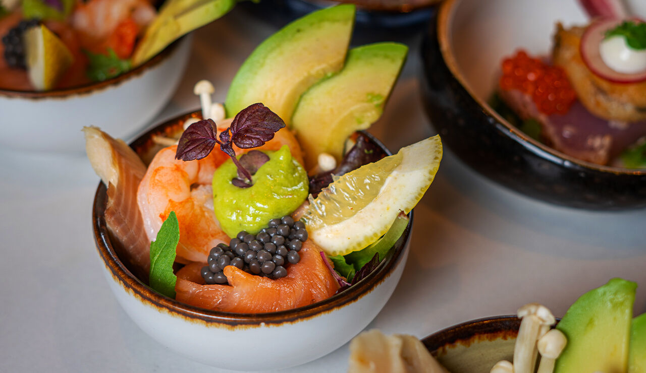 Viscocktail met zalm, kaviaar en forel en enoki paddenstoelen