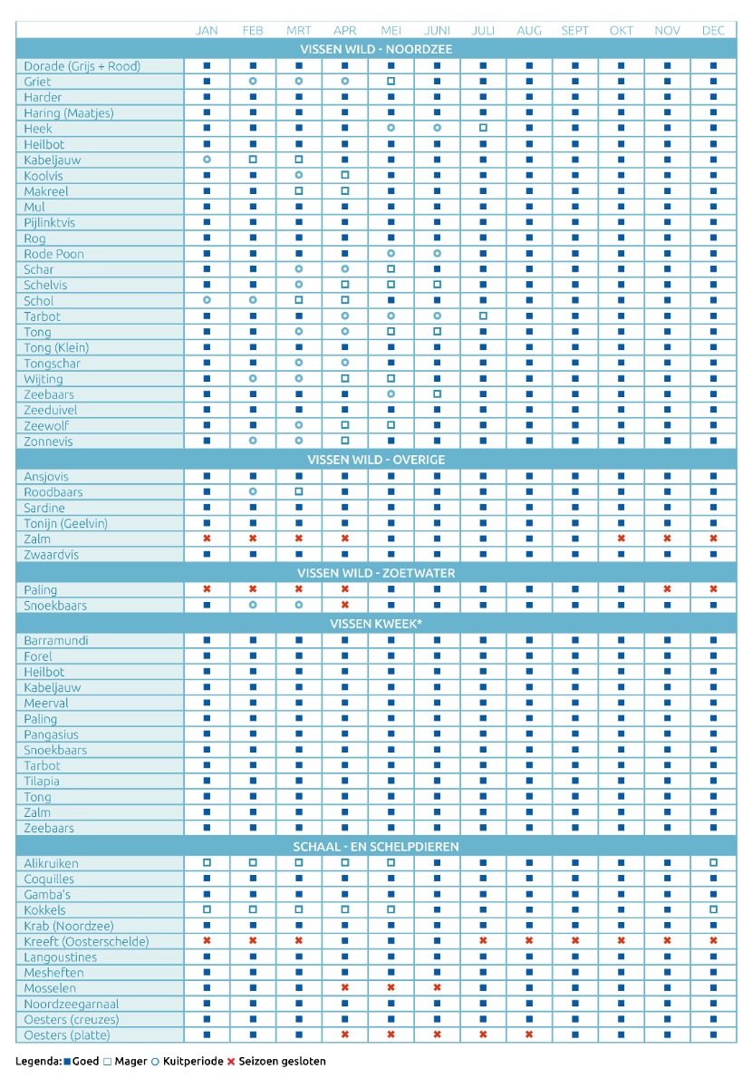 *Kweekvis is het gehele jaar goed verkrijgbaar omdat deze vissoorten niet afhankelijk zijn van klimatologische omstandigheden en andere factoren die wel van invloed zijn op wilde vissen. Deze kalender is een indicatie en het resultaat van vergelijking van gegevens. Vissen trekken zich van de kalender niets aan. Paaiperioden zijn niet altijd gelijk. Klimaat en andere factoren, zoals het voedselaanbod in zee, beïnvloeden het gedrag van vis. Laat u daarom altijd adviseren door uw visleverancier die goed de kwaliteit kent van de vis van het moment.