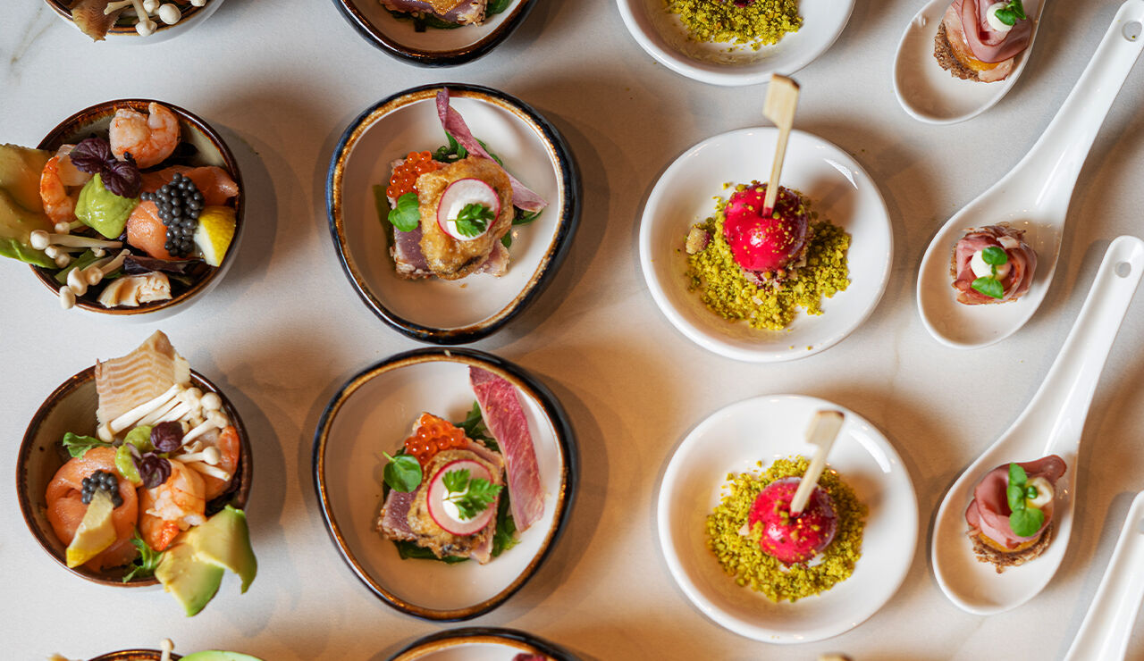 Walking dinner amuses met o.a. een viscocktail, geitenkaas lolly en tonijn tataki