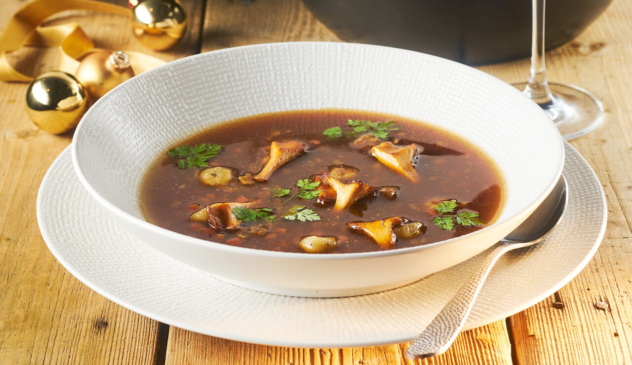 Wildsoep met gnocchi en gebakken cantharellen