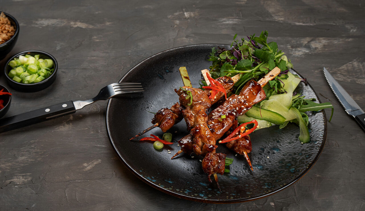 - Leg de skewers speels over elkaar heen op het bord en garneer deze af met de fijngesneden bosui en rode peper.
