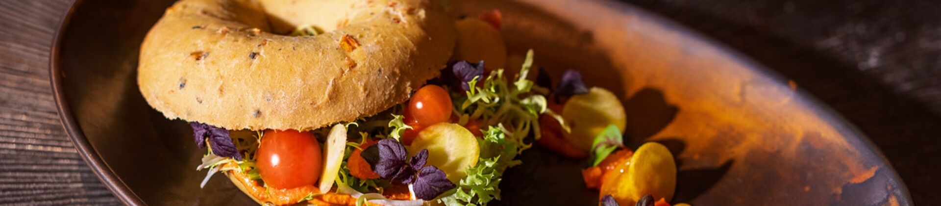 Leg tussen de bagel de cherry tomaten en garneer het broodje af met de shiso purple.