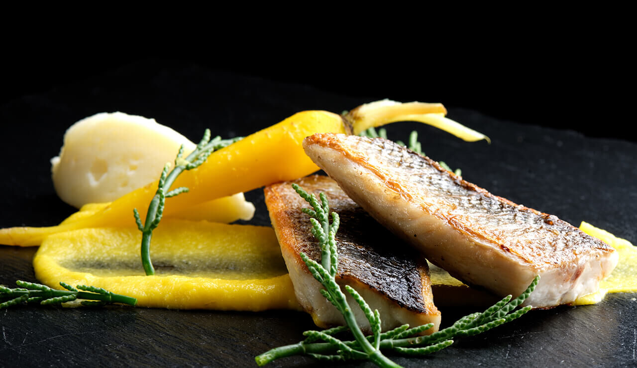 - Verwijder de graten uit de zeebaarsfilet en snijd uit 1 filet 2 stukken van 40 gram per stuk.