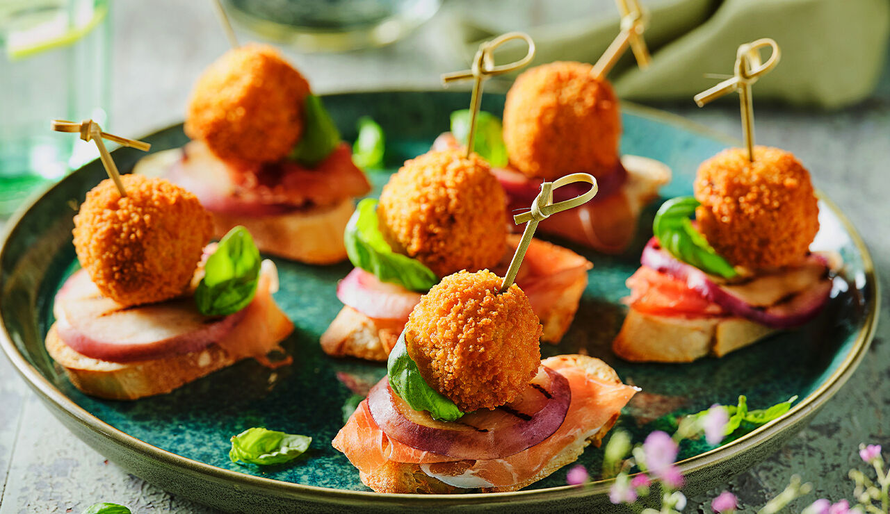 Zomerse Bitterballen pintxos met prosciutto en gegrilde nectarine