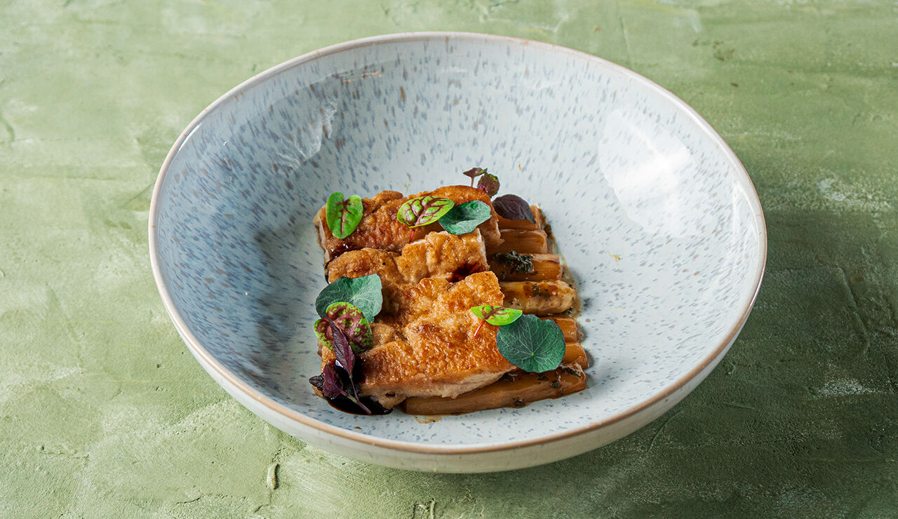Zwezerik met gebakken asperges en jus, winterpeen, kervel en oestersaus.